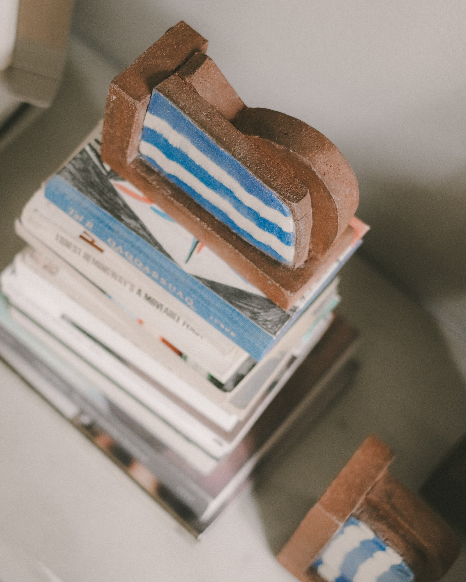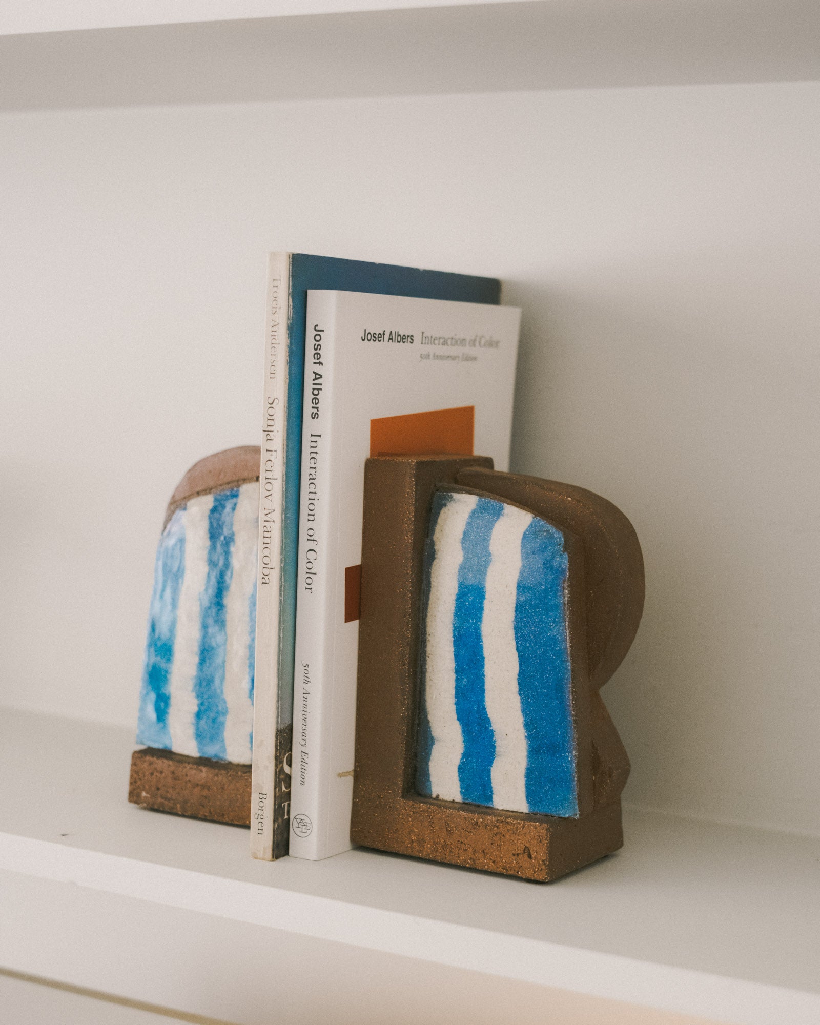 One-of-a-kind ceramic bookends handmade from pigmented clay with inlaid banded patterning, designed as both sculptural objects and practical supports.