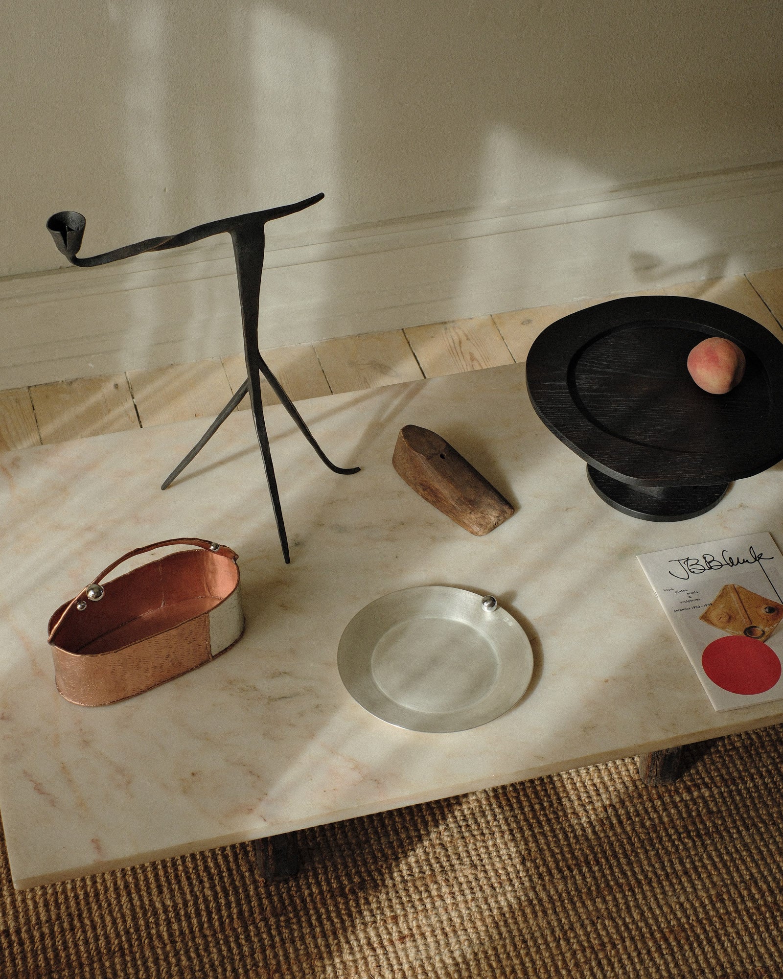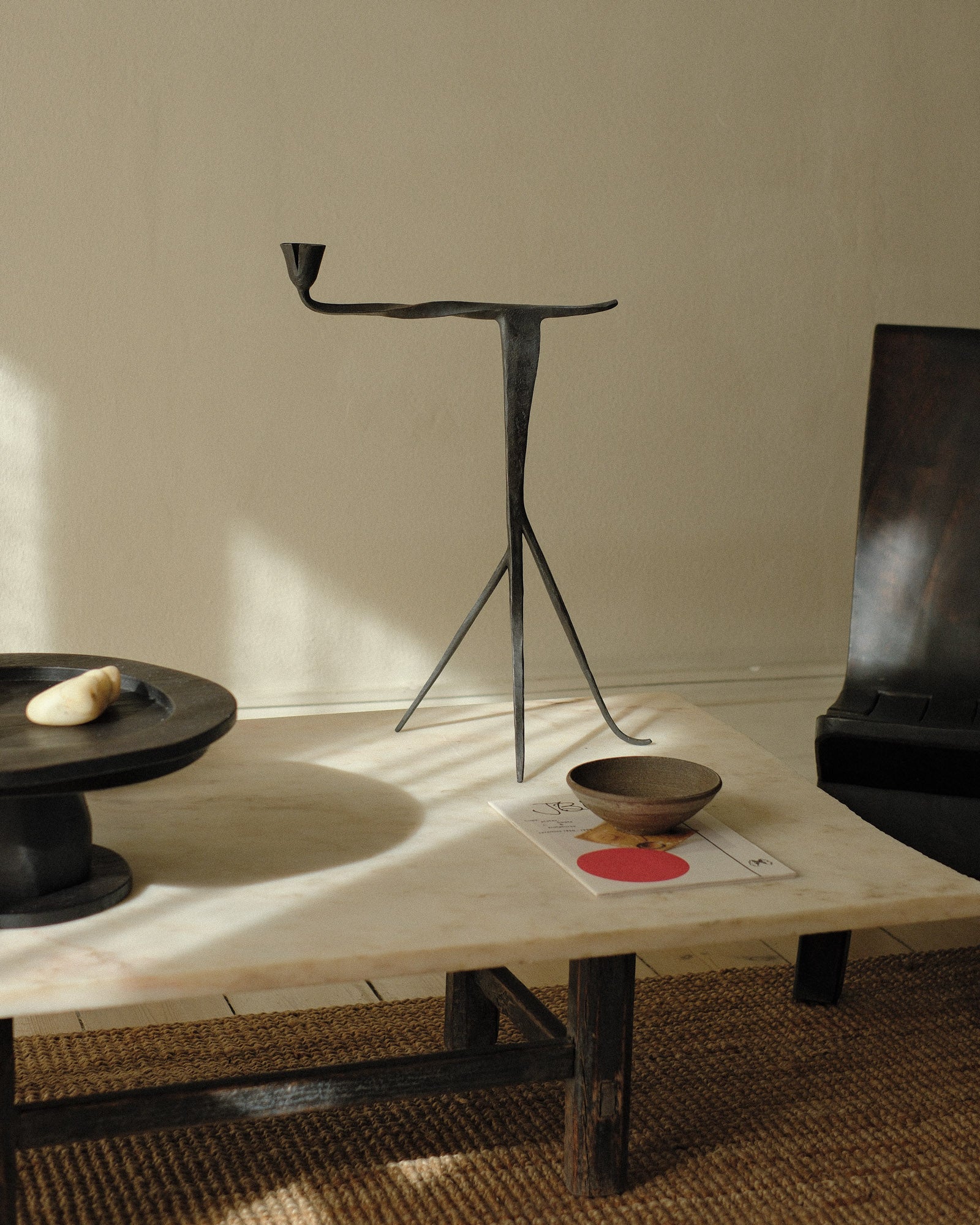 Developed with blacksmith Andreas Billert, this candle holder extends the Campanula series into a vertical composition. The forged stem bears subtle irregularities, balancing precision with the natural tension of metalwork. Each piece reflects a dialogue between maker and material; the result is a form that is deliberate, weight-bearing, and responsive to touch.
