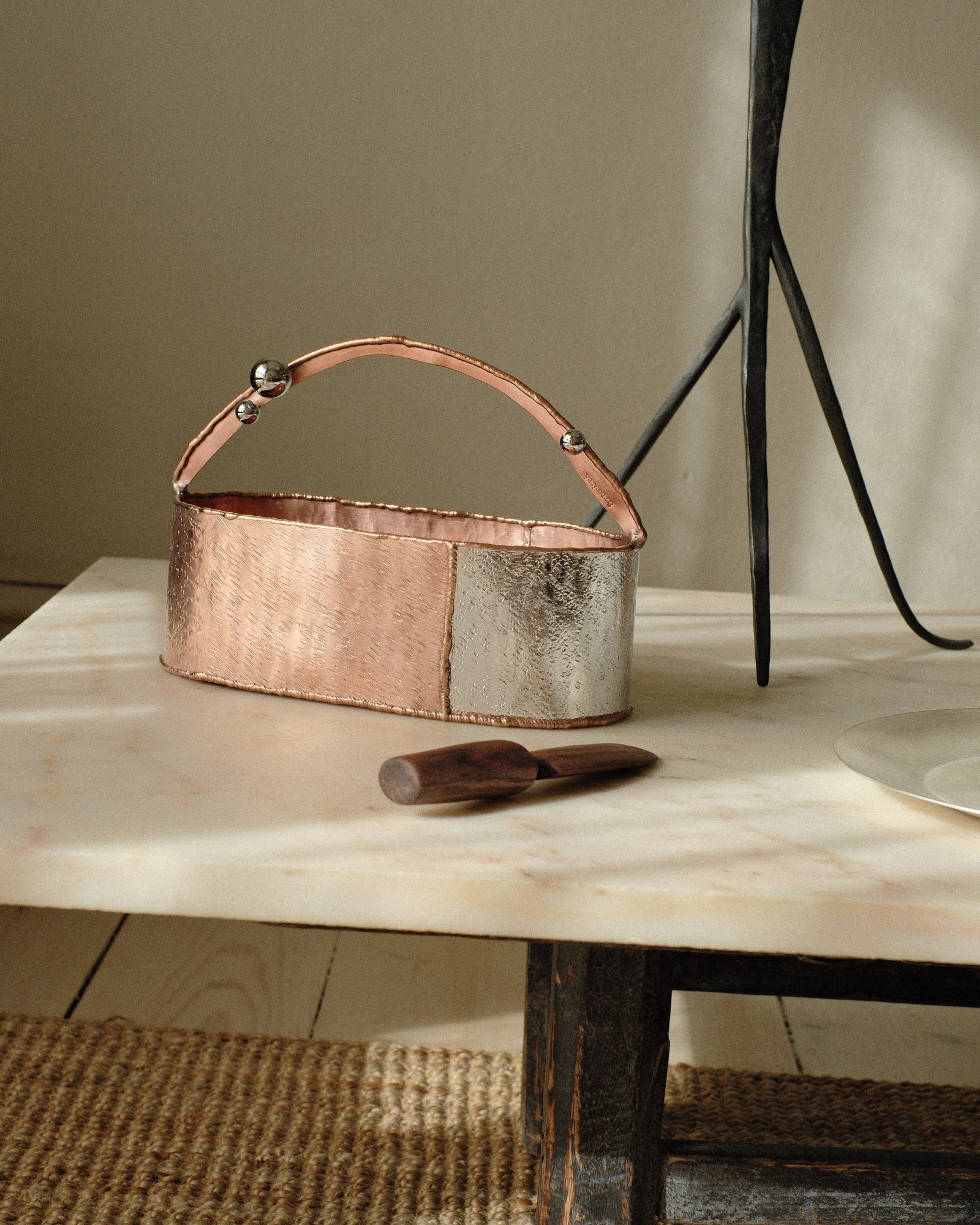 Container 1 brings together copper and brass leaf in a composition defined by contrast and restraint. The layered metals shift between matte and sheen, catching light along their joined surfaces. The form is carefully proportioned and balanced, suitable for holding small objects or standing alone as a crafted detail on a table or shelf.
