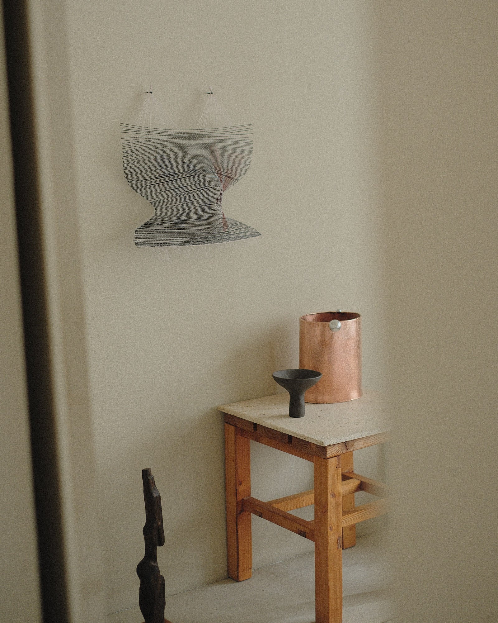 Deep blue wire stretched across white thread painted in red and blue, creating a linear rhythm that evokes motion and distance. Highway extends Fiedler’s study of woven line as drawing, where movement is mapped rather than depicted. The piece hums with directionality.