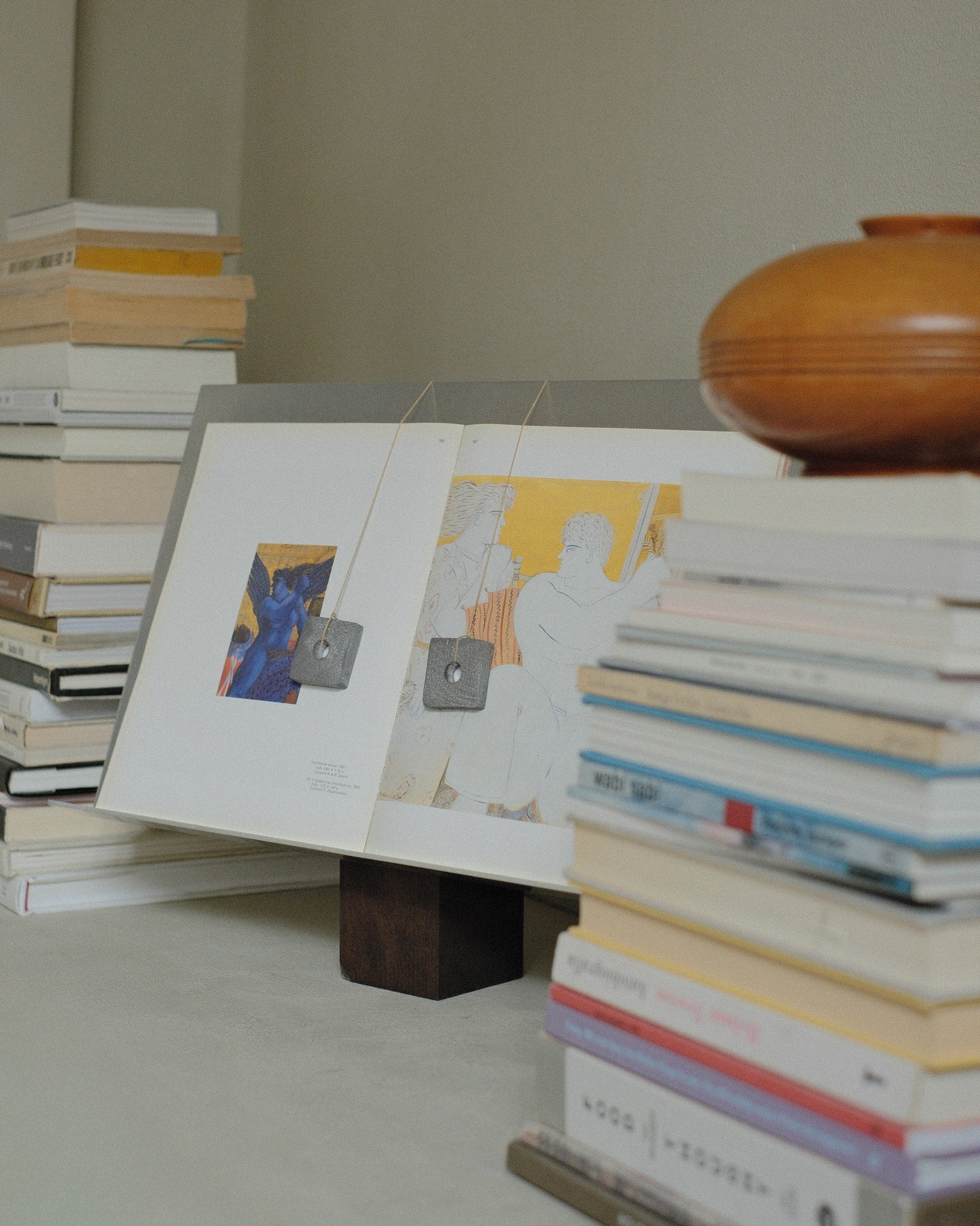 Originally designed to keep recipe books open while cooking, Book Stand now extends its use to display art books and printed matter. Balancing crafted wood, weighted cords, and metal fittings, it frames the act of reading as both functional and sculptural.