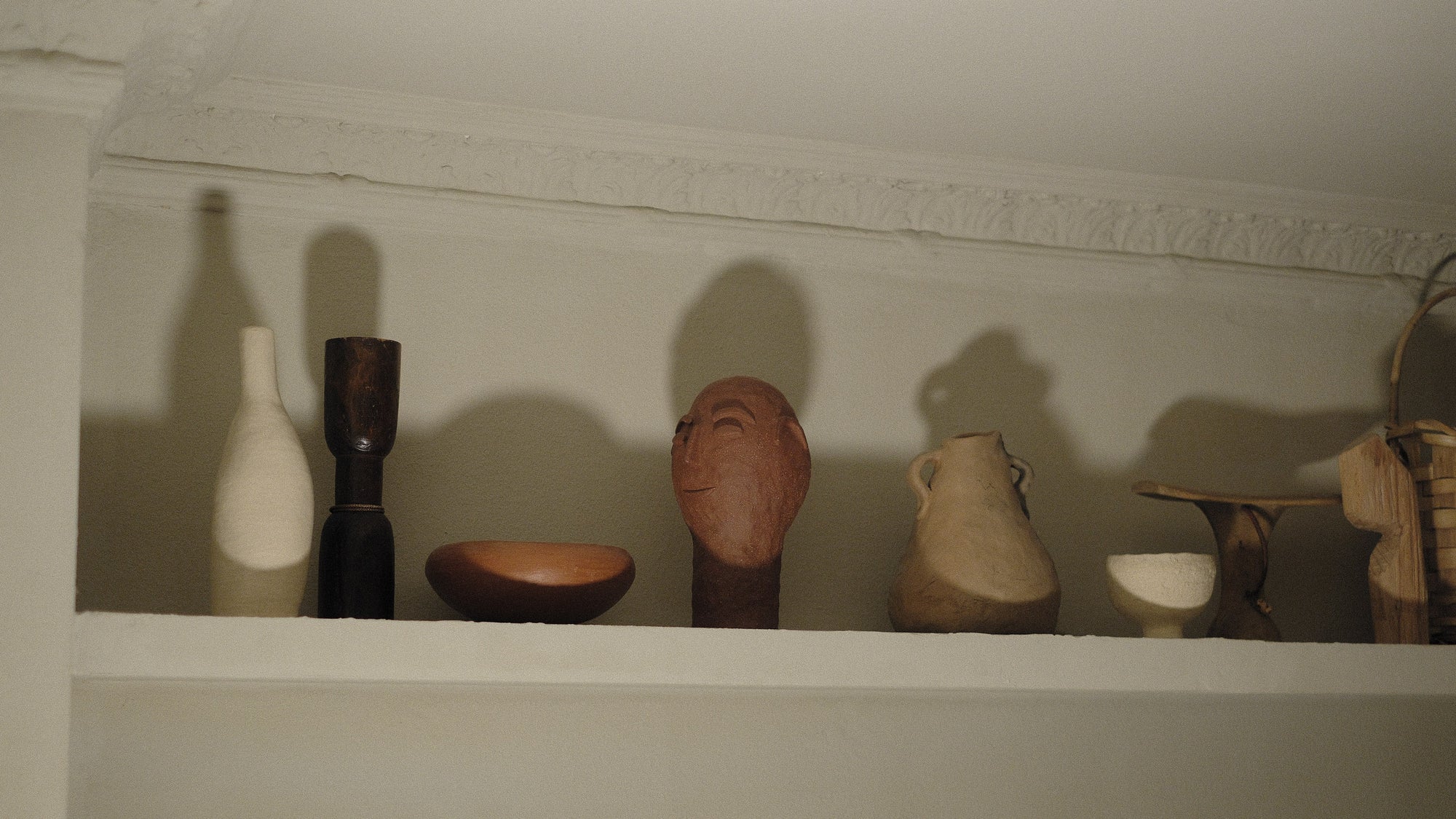 Elongated stoneware form drawn into a gentle taper, rising to a narrow mouth. The proportions are upright and composed, with a subtle asymmetry that reveals its handbuilt origin. Glazed on the interior and left unglazed on the exterior, the matte surface absorbs light softly, emphasising the vessel’s quiet verticality.