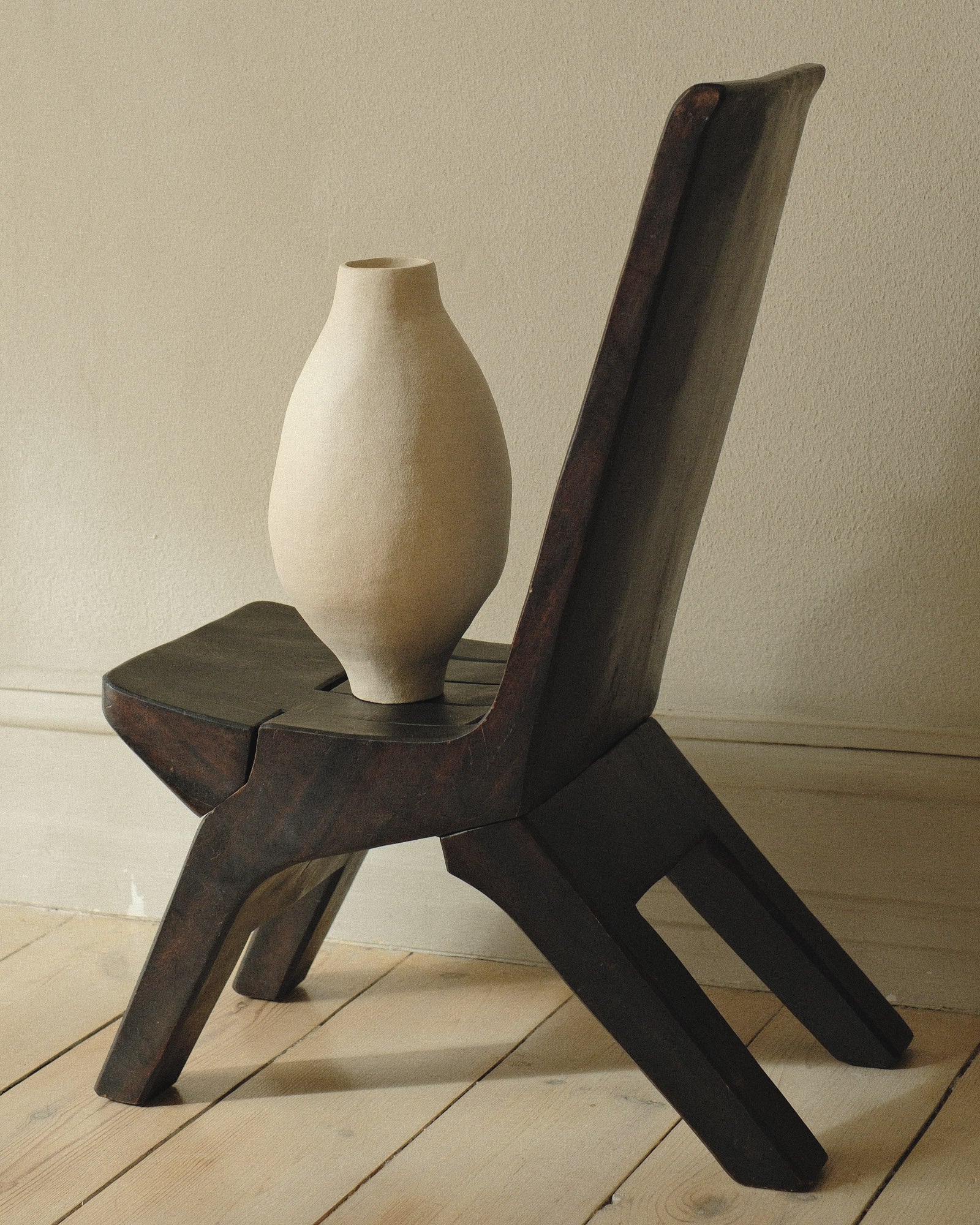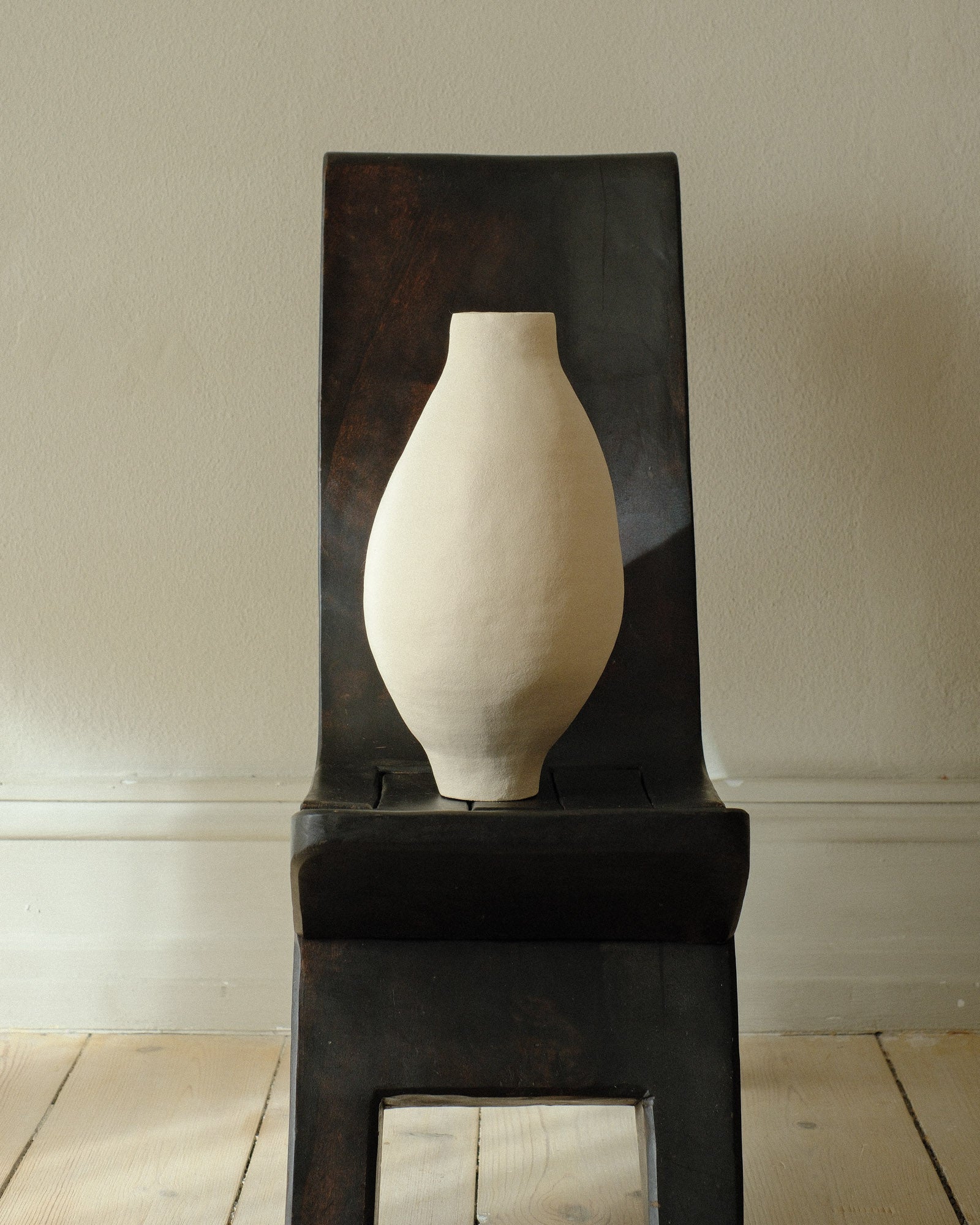 Hand-built stoneware rising into full contour, its body swelling before narrowing to the rim. The profile feels organic, shaped by intuition rather than measure. The interior is glazed, while the exterior remains unglazed and matte, allowing the natural tone of the clay to define its presence.