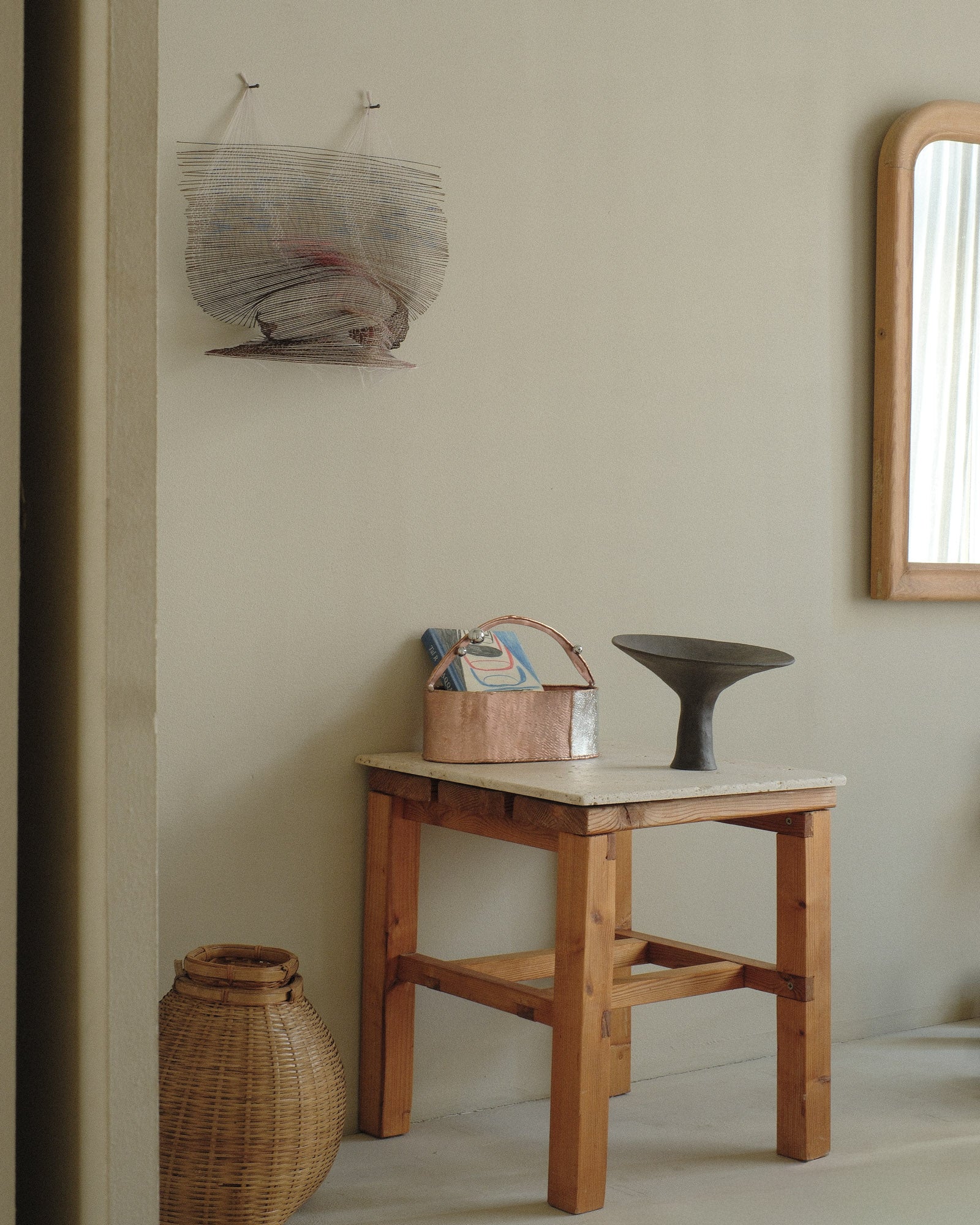 Brown wire with red and blue tones combined with white thread to create an interwoven composition, producing subtle variations in shadow and surface as light moves across the piece. The composition recalls both textile pattern and digital scan; a signal made visible. In Fiedler’s work, weaving functions as notation, recording motion through structure, each intersection a point of tension and release.