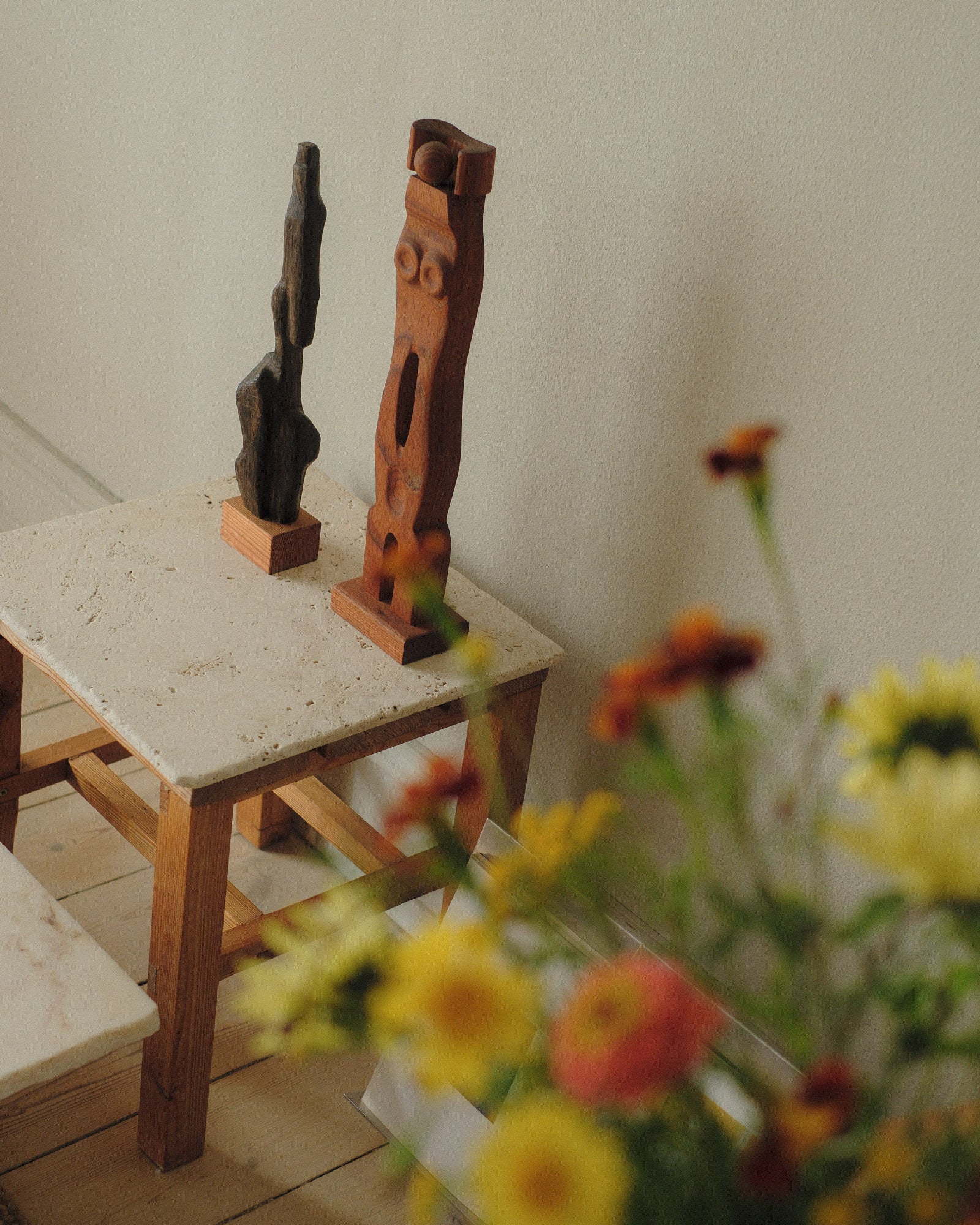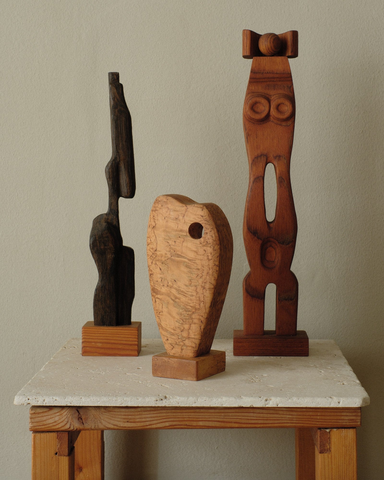 Sven Olsson was a Swedish sculptor active from the 1950s to 1970s. Working primarily in wood, he carved forms that balance abstraction and figuration, translating material weight into quiet, tactile presence. Carved from solid wood into a vertical totemic form, this work combines geometric incision with organic outline.