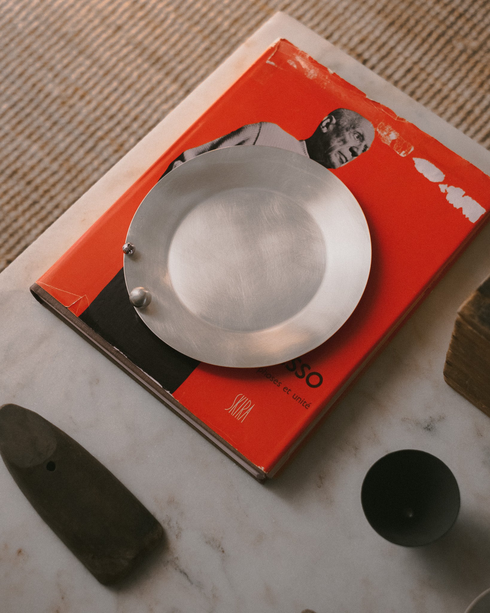 Composed in silver-plated copper, Plate 3 balances circular form with two polished spheres that interrupt its perimeter. Their placement alters weight and perspective, drawing the eye along the plate’s soft curvature. The brushed surface diffuses reflection, transforming a simple vessel into a study of gravity, symmetry, and suspended motion.